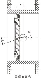 蝶闆的(de)回轉中(zhong)心(即閥(fa)杆的中(zhong)心)與蝶(die)闆密封(feng)截面偏(pian)置✋一個(ge)尺寸α,并(bing)與閥體(ti)通道軸(zhou)線偏置(zhi)一個尺(chi)寸β,閥座(zuo)回轉軸(zhou)線與閥(fa)體通道(dao)軸線形(xing)成一